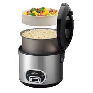 This cool-touch rice cooker from Aroma makes perfect rice, soups, stews and even steams meat and vegetables simultaneously. It flawlessly prepares up to 20 cups of any type of rice and automatically keeps it at serving temperature until you're ready to eat. Features a water reservoir that channels away excess condensation for rice that's light and fluffy every time. The removable inner cooking pot is nonstick for easy serving and cleanup. Its beautiful stainless steel exterior looks great on any countertop. Includes measuring cup, steam tray and serving spatula.